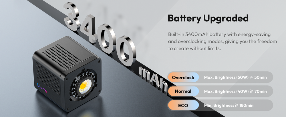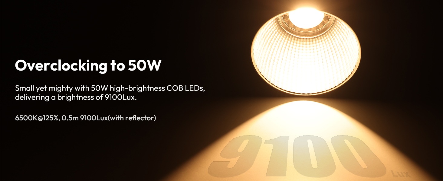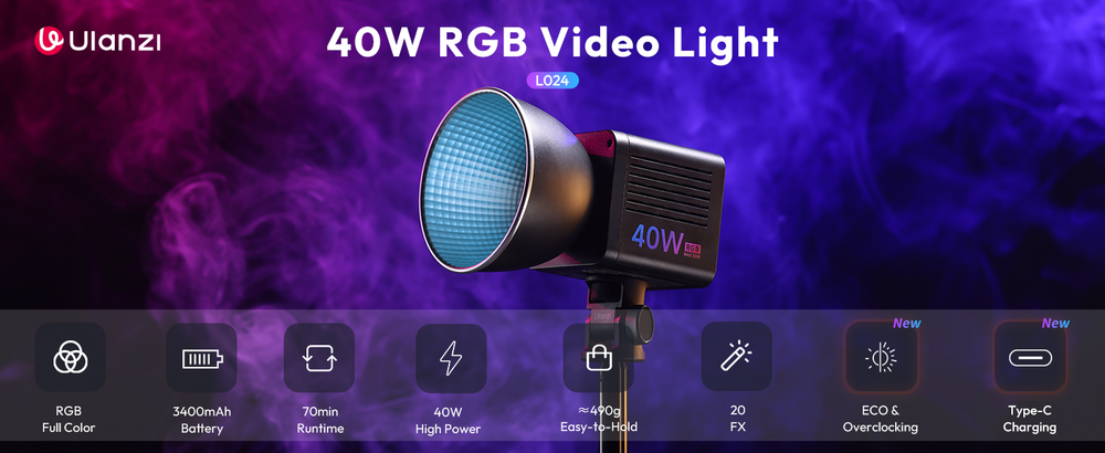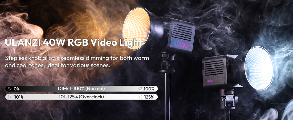- 【High-Brightness COB Lighting】ULANZI 40W Pro RGB Portable LED Video Light is equipped with a 40W high-output COB LED light source, delivering uniform brightness. In overclock mode, it boosts to 50W, achieving 9100Lux at 0.5m, ensuring bright, clear illumination. Features reinforced glass for high light transmittance and heat resistance.