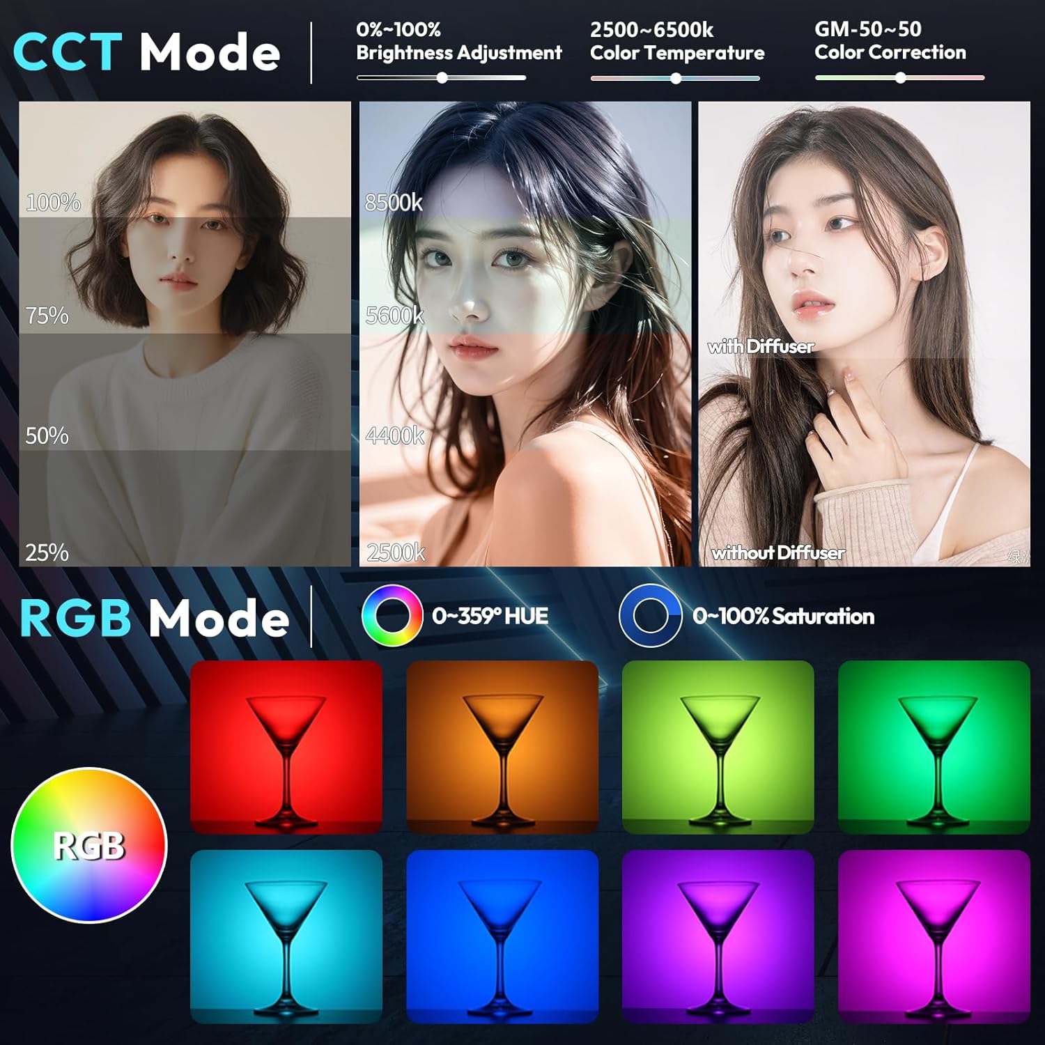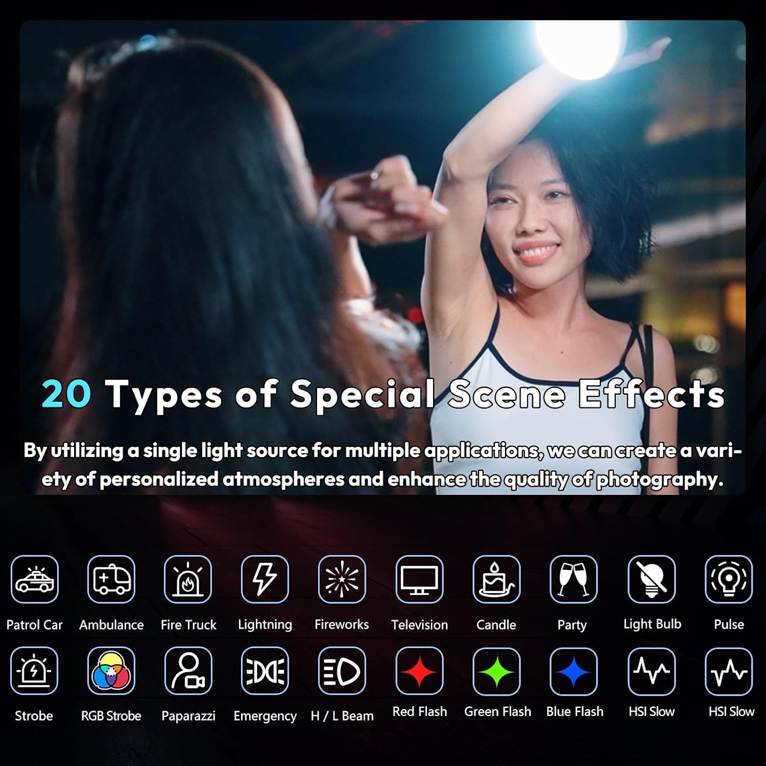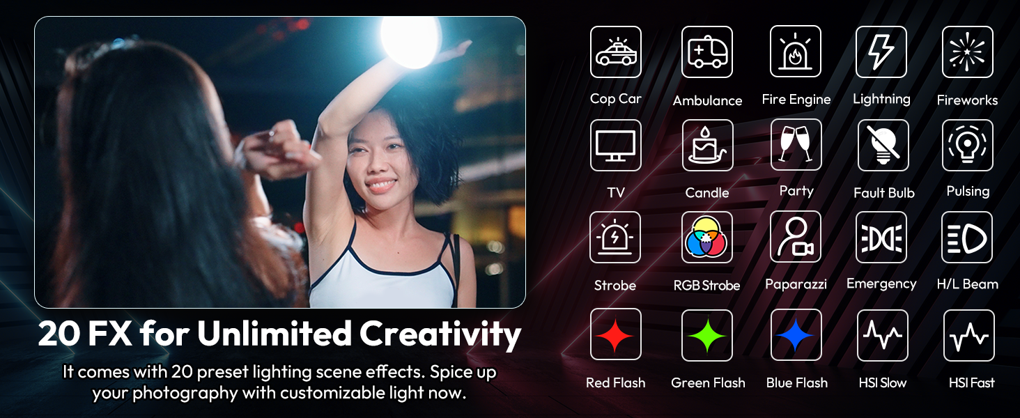 - 【Versatile Scene Effects】Offers 20 customizable scene modes, including RGB strobe, emergency lights, and party effects, perfect for photography, events, and creative lighting setups.